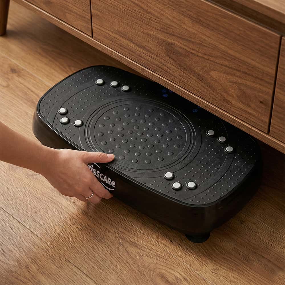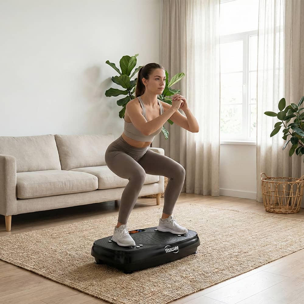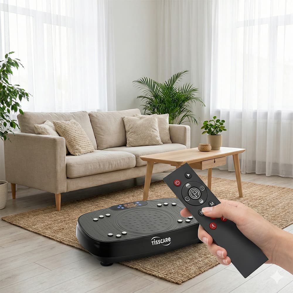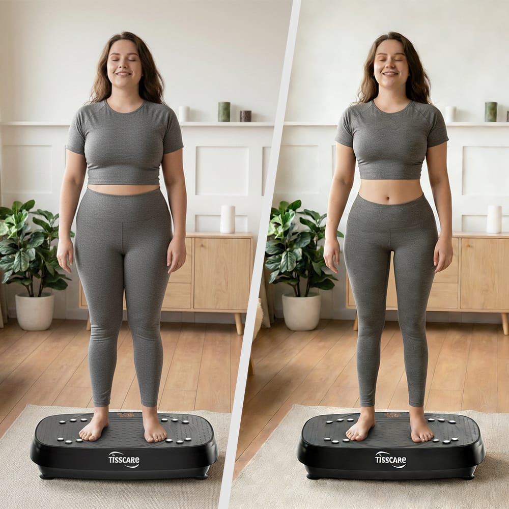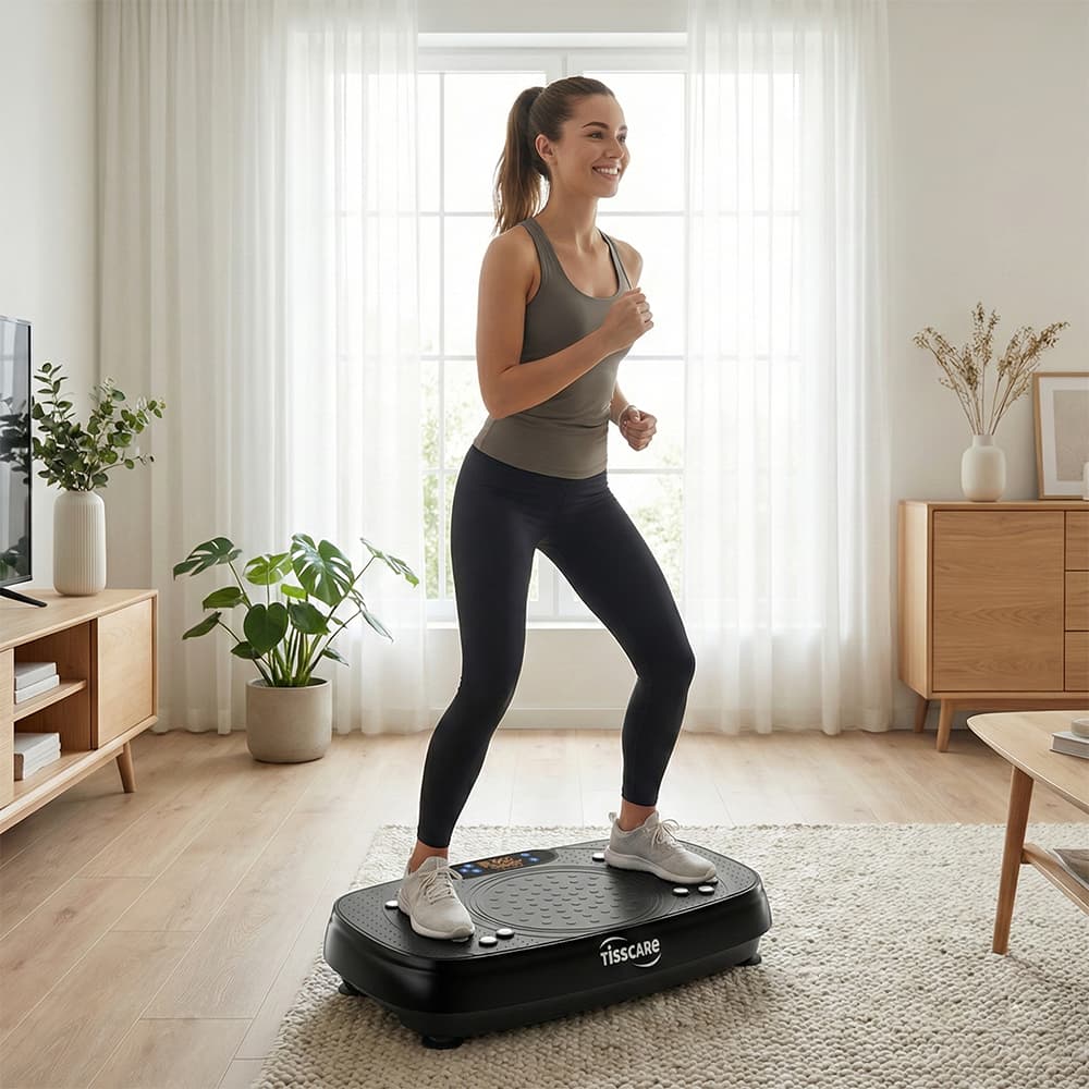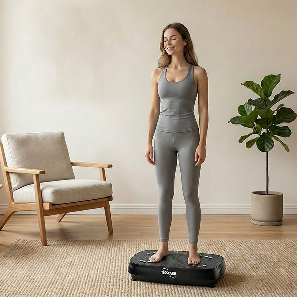 Tisscare vibration plate uses controlled, high-frequency vibrations to activate muscles throughout your body. These vibrations cause muscles to contract and relax rapidly, helping increase muscle engagement, circulation, and calorie burn — even in short sessions.